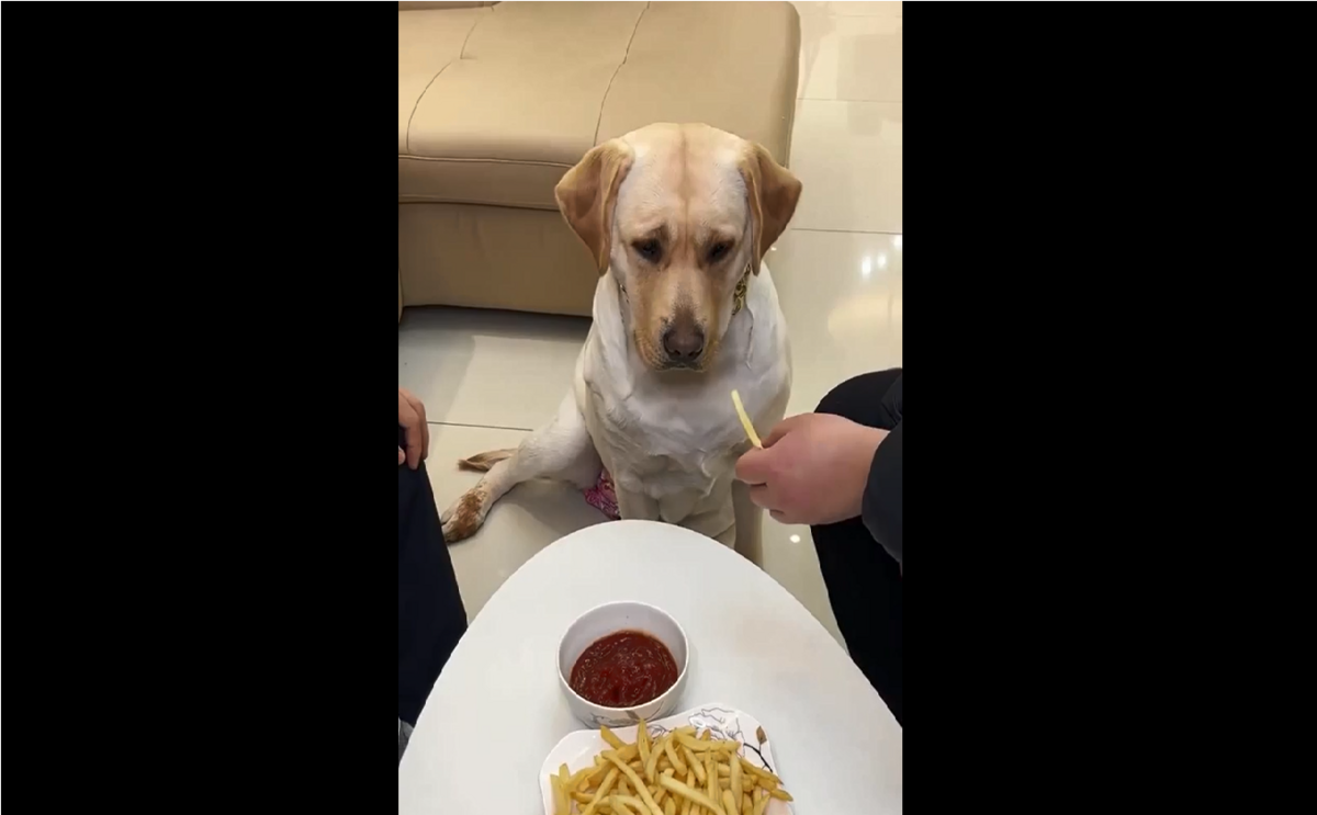 Dù xin ăn nhưng chú chó siêu chảnh vẫn quyết ngoảnh mặt khi miếng khoai tây chiên chưa được chấm tương ớt.