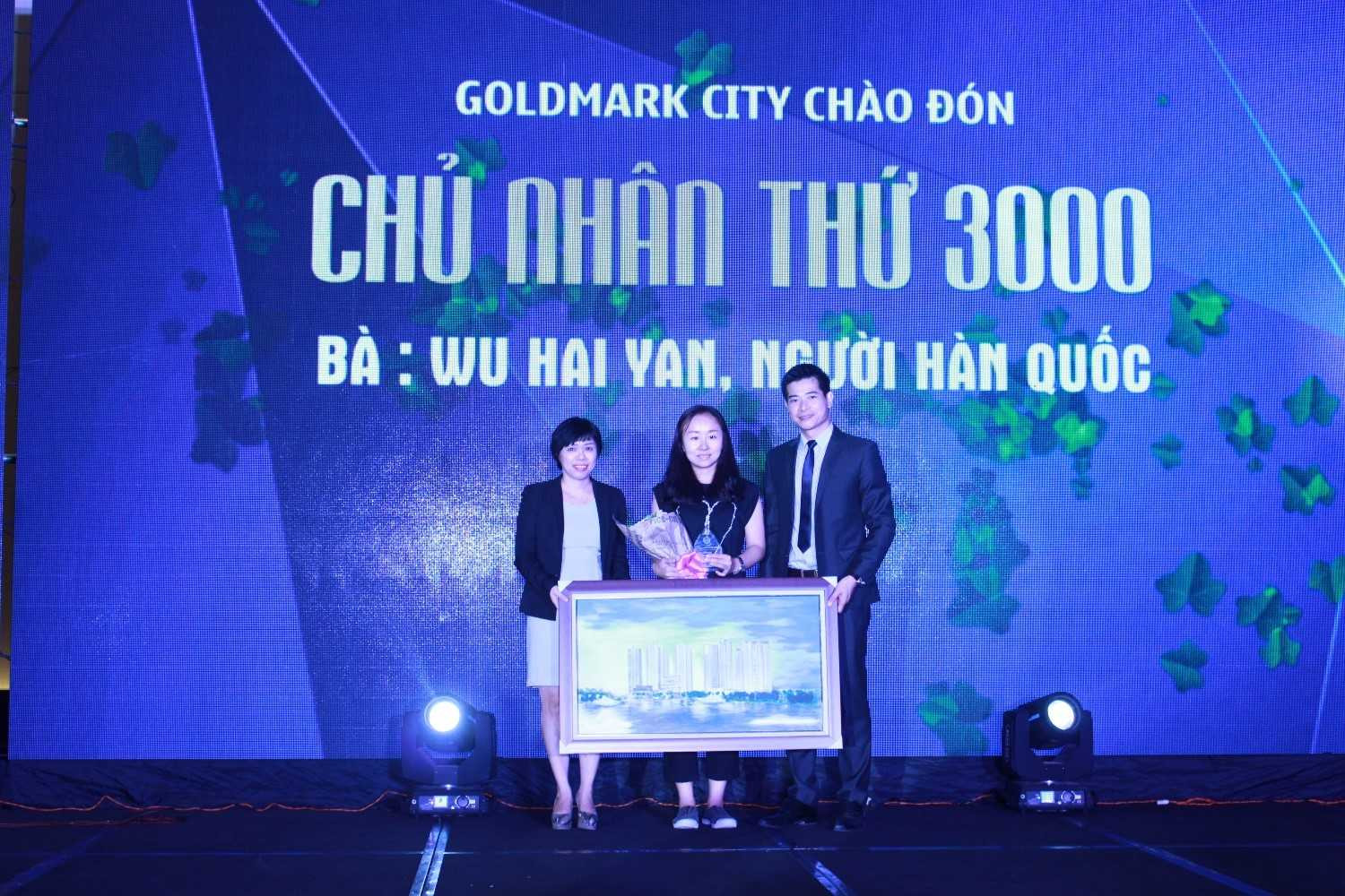 Bà Wu Hai Yan (quốc tịch Hàn Quốc), chủ nhân thứ 3.000 của dự án Goldmark City đã được đại diện TNR Holdings trân trọng gửi lời cảm ơn và tặng kỷ niệm chương trên sân khấu. Chia sẻ về cảm xúc của mình, bà Wu Hai Yan cho biết: “Tôi vui mừng và hạnh phúc khi được là chủ nhân thứ 3.000 của dự án này, đồng thời tin tưởng vào sự phát triển của TNR Holdings cũng như an tâm vào việc chọn căn hộ ở đây cho bố mẹ mình”.