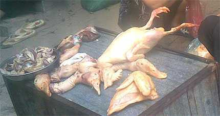 Gà đã cắt tiết được nhúng vào nước lạnh sau đó nhúng nước sôi khoảng 80 độ, vặt lông, mổ moi sạch. Tiếp theo, người này chuẩn bị một chiếc chậu chứa khoảng 10 lít nước có nhiệt độ khoảng 40 độ có pha chút bột sắt bằng đầu đũa.
