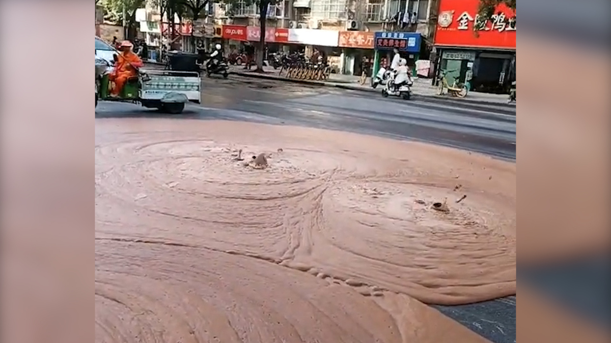 Người dân tại TP Nam Kinh (Giang Tô, Trung Quốc) choáng váng khi chất lỏng "lạ" phun trào và nhanh chóng bao phủ mặt đường.
