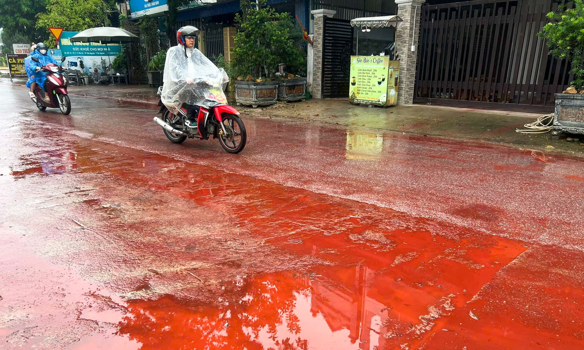 Ghi nhận tại hiện trường, lớp chất lỏng màu đỏ sẫm trải dài cả km, loang ra hai bên đường và chảy xuống các rãnh thoát nước. Nhiều vị trí đọng lại thành vũng lớn, bốc mùi hắc khó chịu.