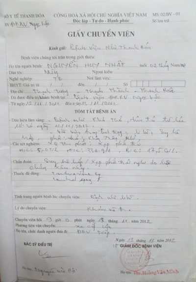 Tại Bệnh viện khu vực Ngọc Lặc đã tiến hành cấp cứu và chẩn đoán cháu Nhật bị suy hô hấp nặng nên sáng ngày 13/11, cháu Nhật được Bệnh viện chuyển xuống Bệnh viện Nhi Thanh Hóa để cứu chữa.