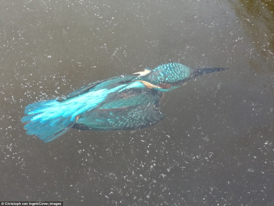 Trong những hình ảnh thời tiết tồi tệ ảnh hưởng đến khắp châu Âu, một con chim bói cá được phát hiện đông cứng dưới mặt nước phía Bắc Amsterdam. Con chim được cho là lặn xuống nước để săn mồi nhưng có thể lạc vào hố băng và không thể tìm được lối ra.