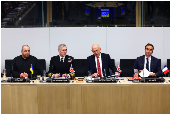 Bộ trưởng Quốc phòng 3 nước Anh, Ukraine, Pháp tham dự cuộc họp của Liên minh các nước sẵn sàng theo hình thức bộ trưởng quốc phòng, do Vương quốc Anh và Pháp tổ chức, tại trụ sở NATO. (Ảnh: Reuters)