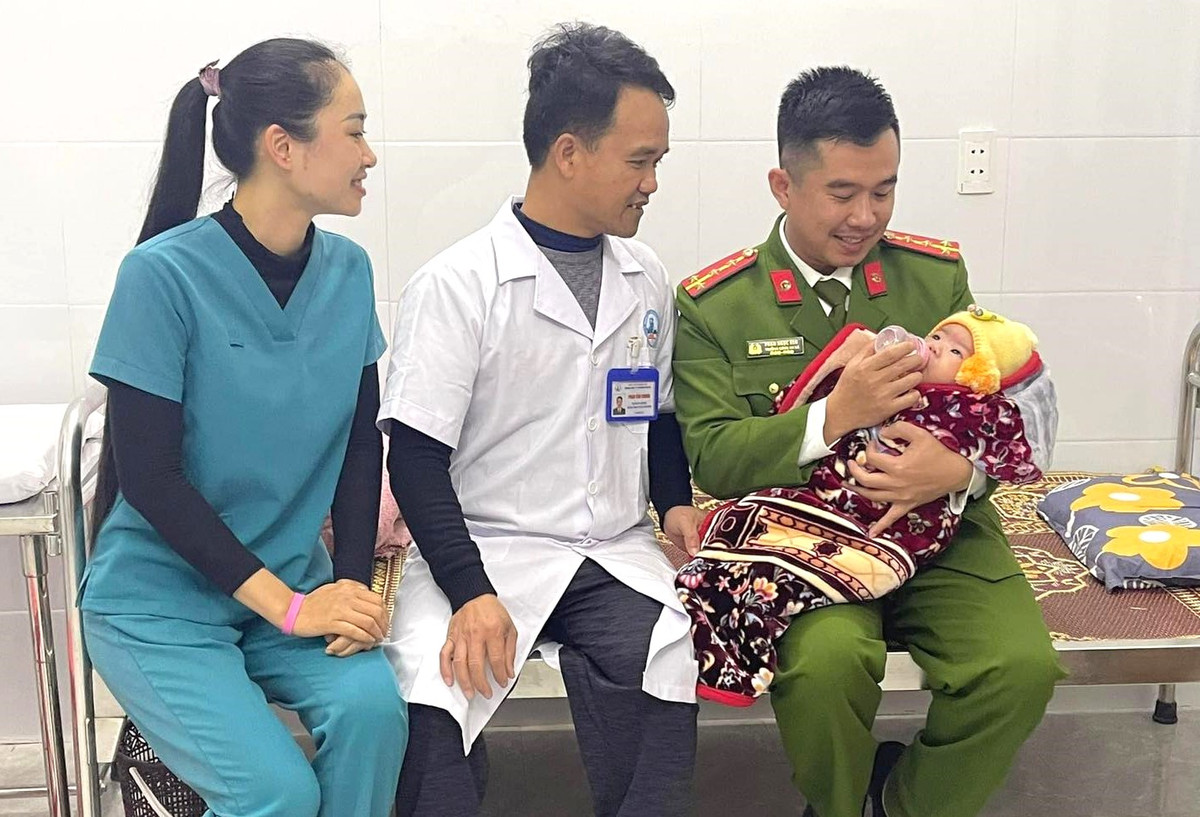 Cán bộ Công an xã Tân Hương và các y bác sĩ đang chăm sóc cháu bé.