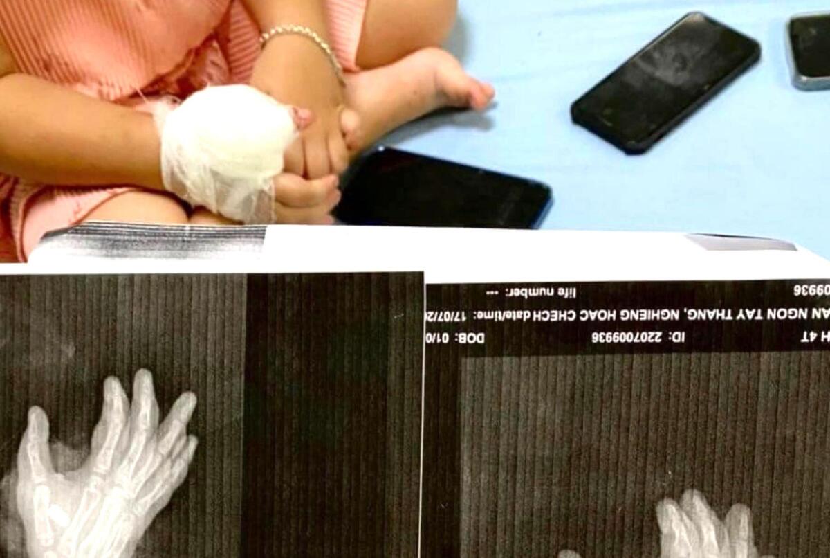 Hình ảnh viên đạn nằm trong tay của cháu bé 4 tuổi. (Ảnh: Công an TP Thanh Hóa).