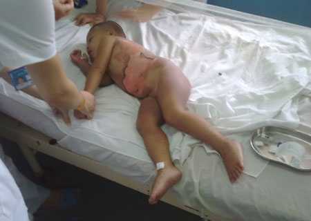 Bệnh nhân là em Ngô Cao Cường, 2 tuổi, trú tại xã Sơn Trạch (huyện Bố Trạch, tỉnh Quảng Bình) được cấp cứu trong tình trạng bỏng độ I – II.  Toàn thân bị bỏng, đặc biệt vùng ngực, bụng, lưng, đùi, hai bên mông và tầng sinh môn.