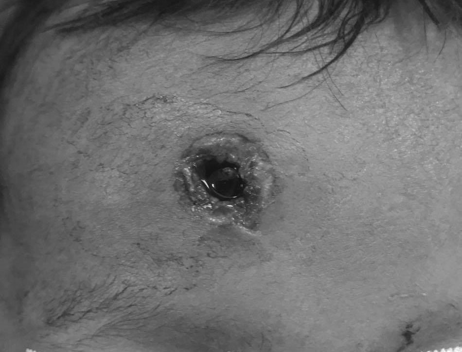 Bác sĩ Nguyễn Ngọc Pi Doanh, Khoa Ngoại thần kinh, BV Nhi đồng 2 cho biết, qua thăm khám bệnh nhi được ghi nhận 1 vết thương hình tròn vùng trán phải, trên bờ hốc mắt khoảng 2cm, máu và dịch não tuỷ chảy ra theo nhịp đập, bờ viên bi còn lấp ló qua vị trí tổn thương.