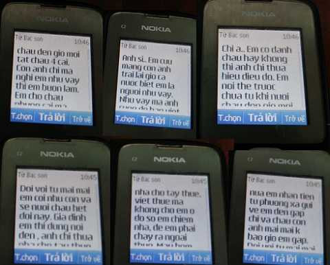 "Anh Sỹ, em cưu mang con anh, trái lại giờ cả nước biết em là người như vậy. Như vậy mà anh cũng để báo viết. Em nghĩ công của em nuôi cháu gần một năm trời cũng lớn lắm đấy. Còn anh vì một chuyện cháu Tú mà đổ lỗi cho em, sau này anh ân hận cả đời không nguôi" - tin nhắn Sơn chủ động nhắn vào số máy của chị Giang.