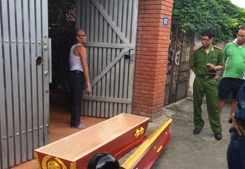 | Chiếc quan tài được đặt trước cổng nhà ông Hòa |