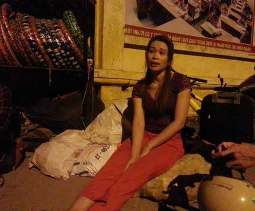 | Chị Hương Giang kể lại sự việc với phóng viên khi đang ngồi bệt trên vỉa hè cùng với đống đồ đạc ngổn ngang. |