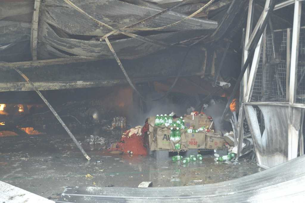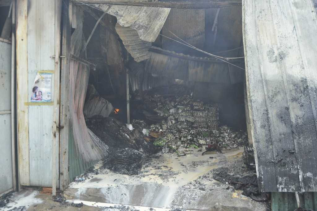 Các kho hàng thực phẩm bị thiêu rụi hoàn toàn. Sữa chảy lênh láng tại hiện trường