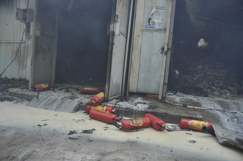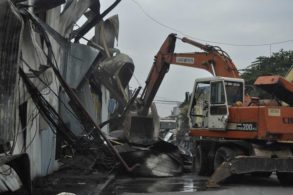 Khoảng 13h30 phút, đám cháy cơ bản được khống chế. Hai máy xúc cỡ lớn được điều động đến hiện trường phá mái tôn thoát khói, để lực lượng cứu hỏa tiếp cận bên trong, dập tắt hoàn toàn đám cháy.