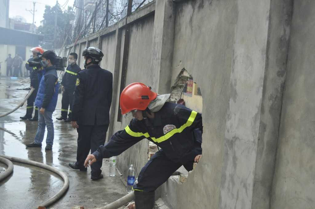 Do đám cháy từ giữa kho lan ra ngoài nên các lực lượng tham gia chữa cháy phải phá các bức tường chắn để tiếp cận đám cháy từ nhiều phía, không để ngọn lửa bùng phát trở lại.