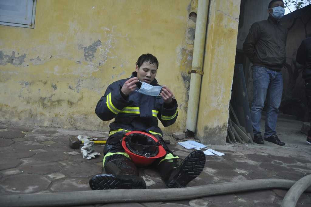 Chiến sĩ cảnh sát PCCC mệt lử sau khi vật lộn với giặc lửa