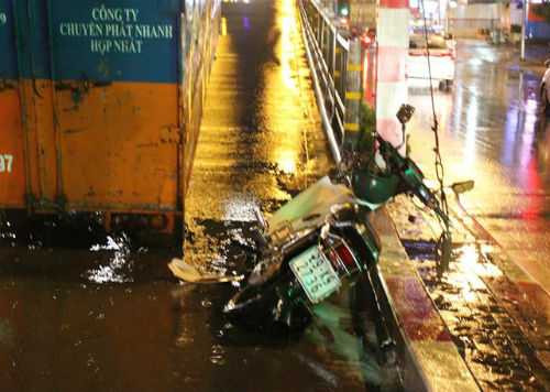 (VTC News) – Thùng chiếc xe tải rơi xuống đường sau khi đập phải thanh hạn chế chiều cao cầu vượt, ít phút sau một chiếc xe máy lao tới đã đâm vào thùng xe tải.