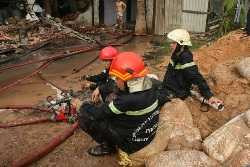 Sau hơn 1 giờ tích cực dập lửa, đám cháy dần được khống chế và dập tắt hòan toàn. Cơ sở pha chế Sơn Đức bị sụp đổ hoàn toàn - ảnh: H.C