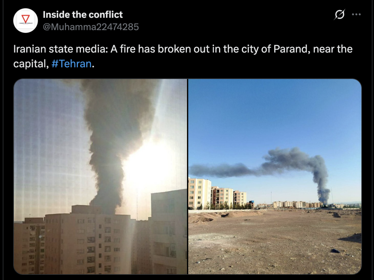 Hình ảnh lan truyền trên mạng xã hội cho thấy đám cháy bùng phát gần Tehran giữa lúc căng thẳng Mỹ - Iran leo thang. (Ảnh: Inside The Conflict/X)