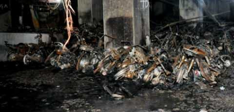 | Hàng trăm xe máy tại tầng hầm tòa nhà CT4A bị thiêu rụi. |