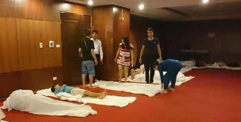 | Do số lượng phòng hạn chế, nhiều người phải trải chăn, ngủ tạm tại hội trường tầng 4 Khách sạn Mường Thanh. |