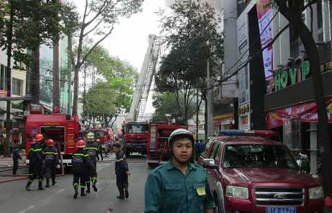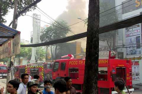 Lửa kèm theo những cột khói đen kịt bốc cao ngùn ngụt tại gara ô tô rồi cháy lan sang cửa hàng thế giới di động trên đường Cống Quỳnh (quận 1, TP.H