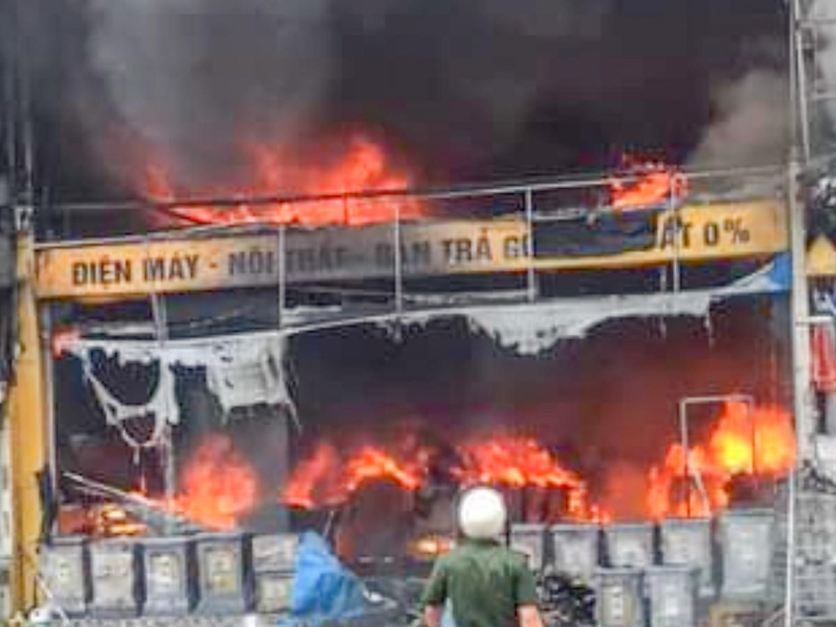Tại hiện trường, ngọn lửa và khói đen bùng lên dữ dội. Các thiết bị điện tử trong siêu thị hư hỏng nặng.