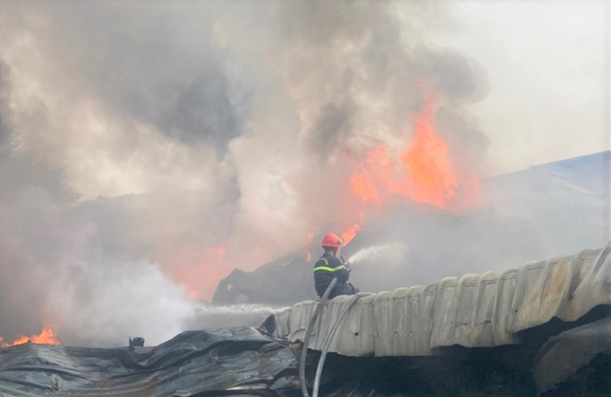 Ngọn lửa lan nhanh, khói đen bao trùm lên toàn bộ nhà xưởng rồi lan rộng ra xung quanh.