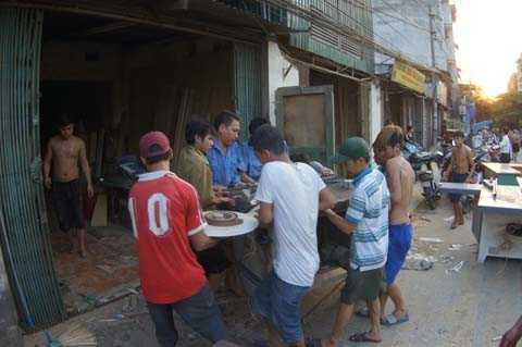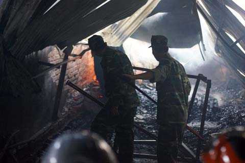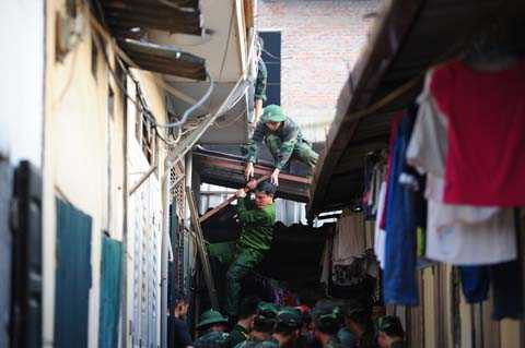 | Công nhân của những xưởng gỗ xung quanh nhanh chóng di dời máy móc, bàn ghế khỏi hiện trường |