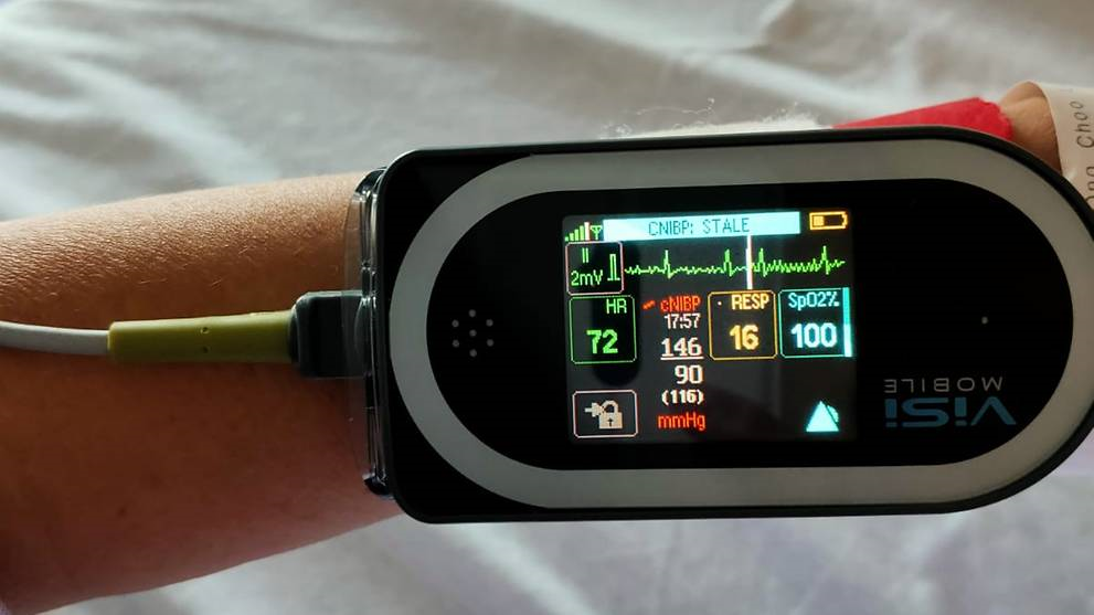 Một thiết bị theo dõi y tế được gắn vào cánh tay của bệnh nhân. (Ảnh: CNA)