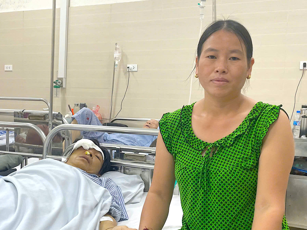 Túc trực bên giường bệnh, chị Kha Thị Xốm liên tục cúi gằm mặt, lộ rõ vẻ lo lắng cho bệnh tình của chồng.
