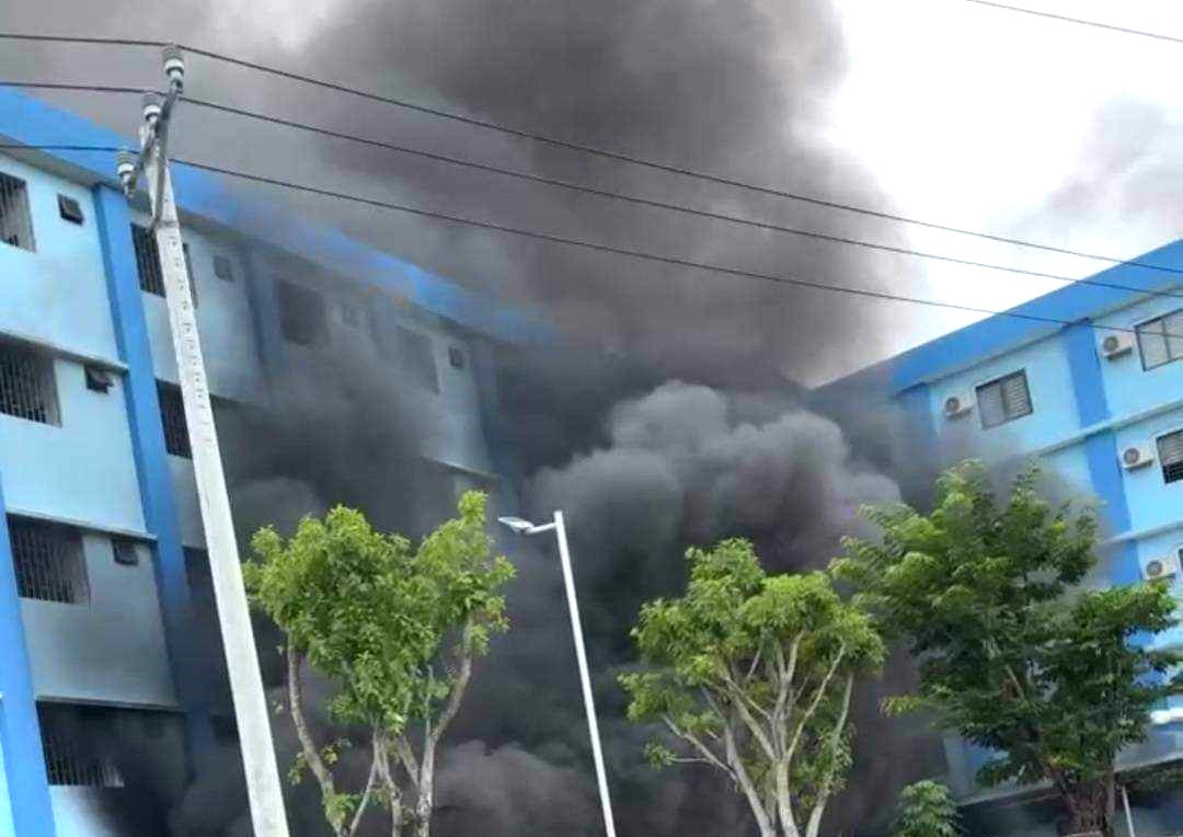 Khói đen bốc lên nghi ngút từ khu vực nhà xe của Bệnh viện Thăng Hoa. (Ảnh: C.A)