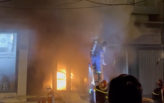 Cháy nhà ở TP.HCM lúc rạng sáng, cảnh sát dùng thang cứu người mắc kẹt.