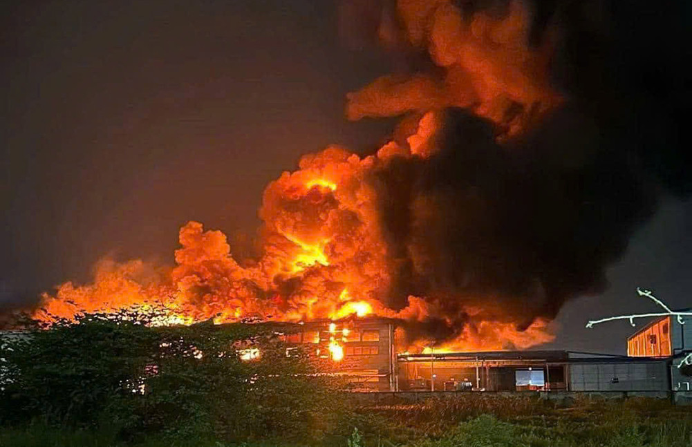 Lực lượng phun nước ngăn chặn cháy lan sang nhà kho và nhà xưởng, đồng thời huy động công nhân di chuyển tài sản ra khỏi khu vực cháy.