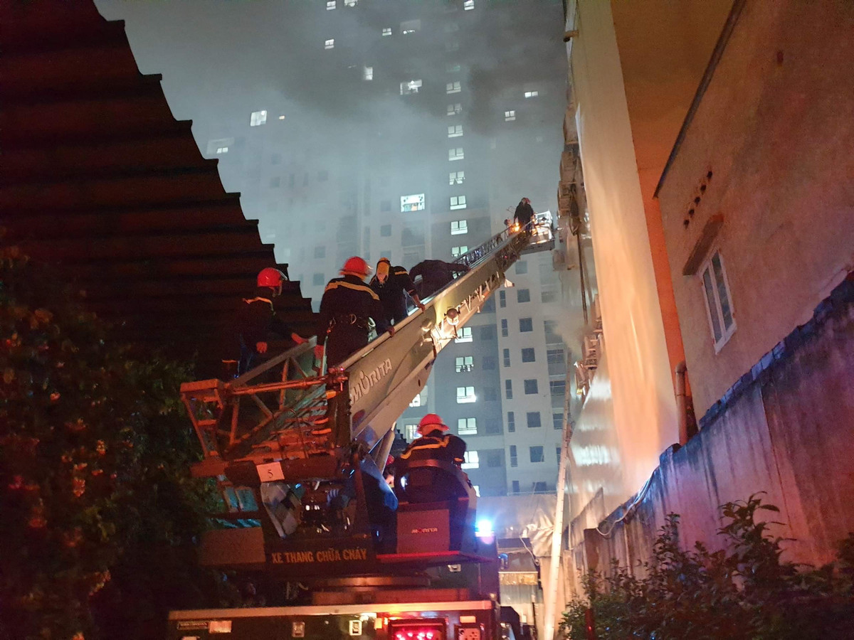 Do ngọn lửa bùng phát ở lầu 3 của quán karaoke, nên lực lượng PCCC phải dùng xe thang dập lửa và hỗ trợ người mắc kẹt.