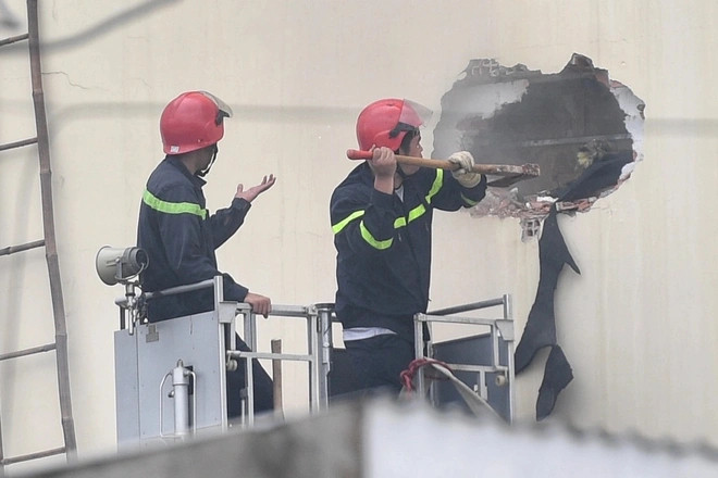 Cảnh sát phòng cháy chữa cháy đục tường, xử lý khói để tìm kiếm nạn nhân vụ cháy quán karaoke An Phú (TP Thuận An, Bình Dương).