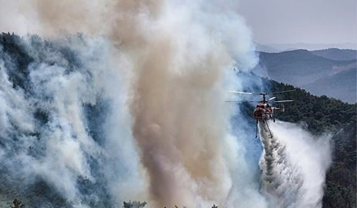 Trực thăng cố gắng dập tắt đám cháy rừng ở quận Uiseong. (Ảnh: Yonhap)