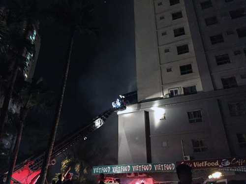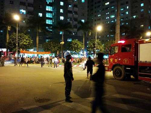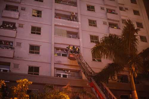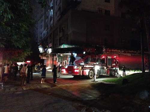 | Các lực lượng chức năng đang có mặt tại hiện trường tổ chức chữa cháy và cứu hộ người dân còn đang mắc mẹt trong các tầng - Ảnh Người đưa tin |