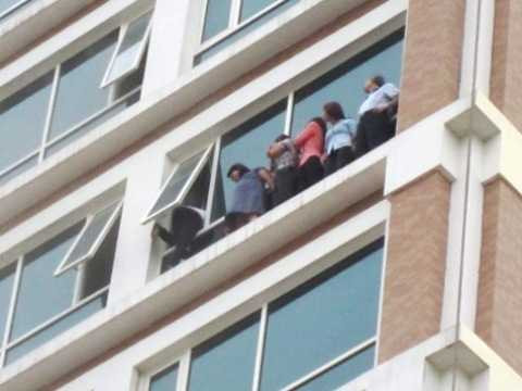 | Nhiều người hoảng loạn đã đứng ra lan can để chờ cứu hộ. |