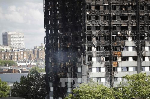 Tòa chung cư Grenfell Tower bị thiêu rụi trong vụ hỏa hoạn. (Ảnh: AFP/TTXVN)