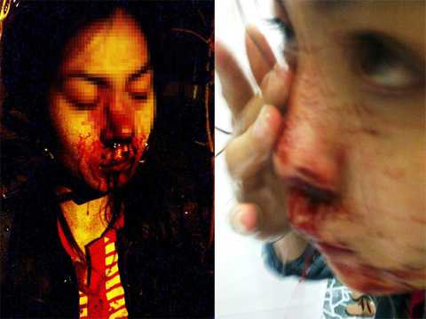 | Hình ảnh mặt đầy máu của chị Nguyễn Thị Kim T sau khi gặp tổ tuần tra thuộc đội CSGT Hàng Xanh lúc rạng sáng 3/4/2014 tại cầu Sài Gòn (Ảnh độc giả cung cấp) |