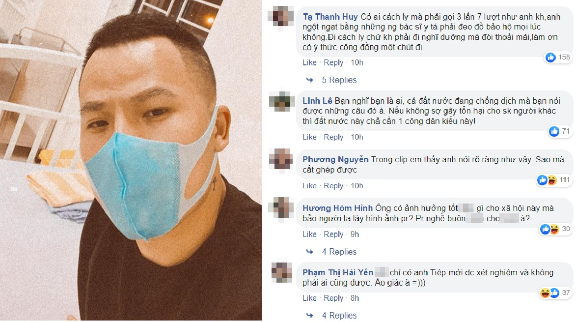 Tạ Thanh Huy viết: "Có ai cách ly mà phải gọi 5 lần 7 lượt như anh không? Anh ngột ngạt bằng những người bác sĩ, y tá phải đeo đồ bảo hộ mọi lúc không? Đi cách ly chứ không phải đi nghỉ dưỡng mà đòi thoải mái. Làm ơn có ý thức cộng đồng một chút đi!".
