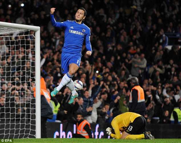 | Đỉnh điểm cao trào tại Stamford Bridge là bàn thắng gỡ hòa 3-3 từ chấm 11m phút 90+4 của Eden Hazard. |