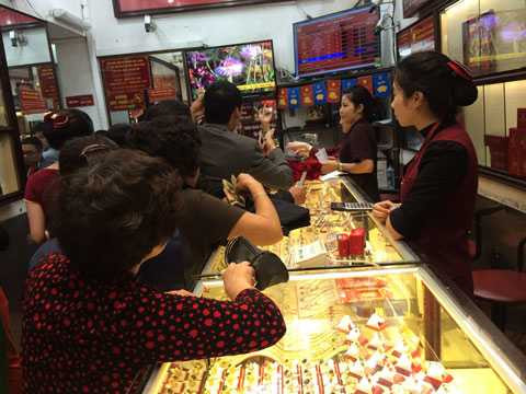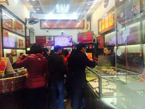 | Bên trong các cửa hàng vàng, khách chen chân nhau mua vàng |
