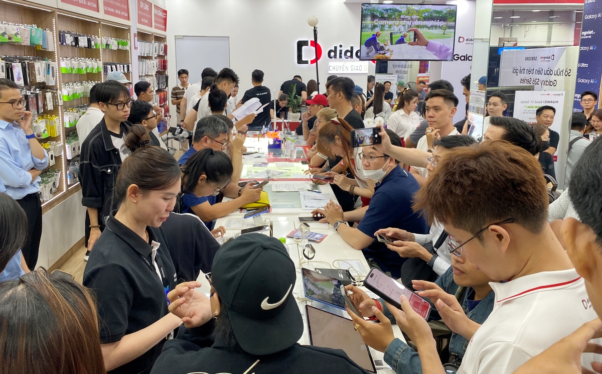 Ghi nhận của PV Báo Điện tử VTC News, tại cửa hàng Di Động Việt trên đường Trần Quang Khải (phường Tân Định), rất đông người dân đã quây kín các tủ trưng bày điện thoại để chờ lấy máy.