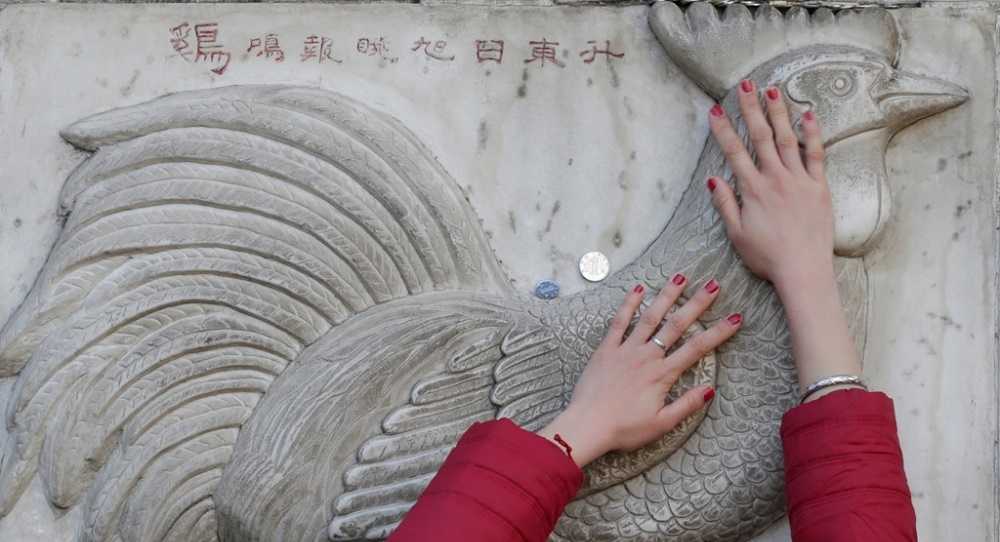 Một người phụ nữ khác cố sờ vào tượng gà bằng đá tại chùa Bạch Vân để cầu may trong năm dậu.