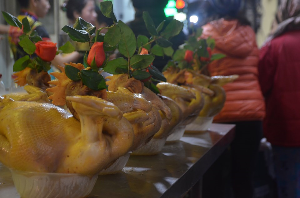 Phố Gia Ngư - chợ Hàng Bè (Hoàn Kiếm - Hà Nội) sáng sớm nay đã tắc nghẽn vì người dân đổ xô mua gà luộc, xôi gấc cúng ông Công ông Táo.