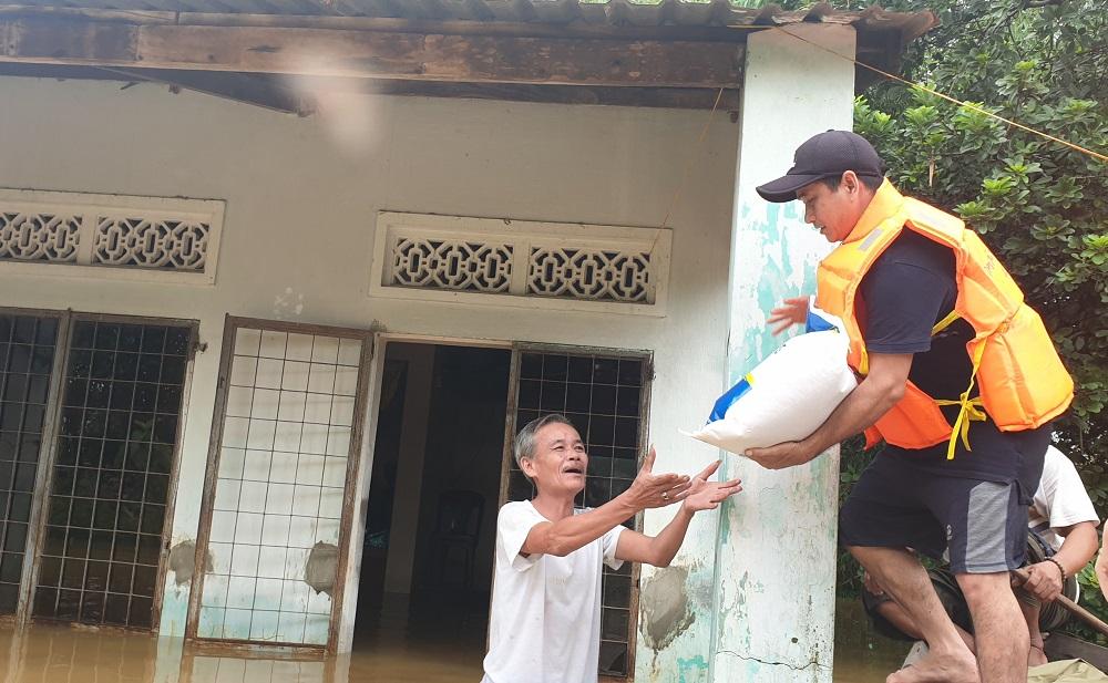 Anh Quang lội nước tới tận ngõ nhà dân để tiếp tế lương thực.