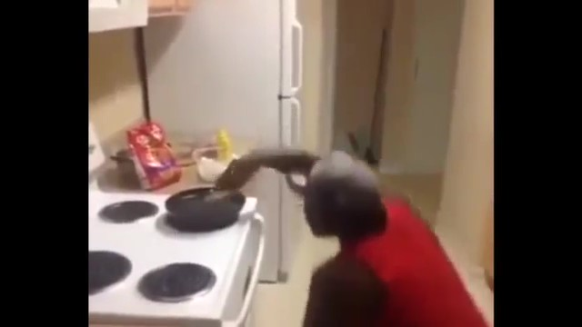 Trông bề ngoài mạnh mẽ nhưng khi vào bếp, anh chàng trong clip lại tỏ ra yếu đuối và dễ sợ hãi lạ thường.