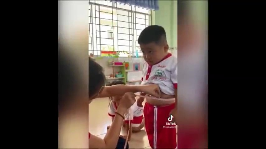 Cư dân mạng cười lăn khi thấy cậu bé trong clip cố gắng hóp bụng trong lúc cô giáo đo vòng 2 của mình.