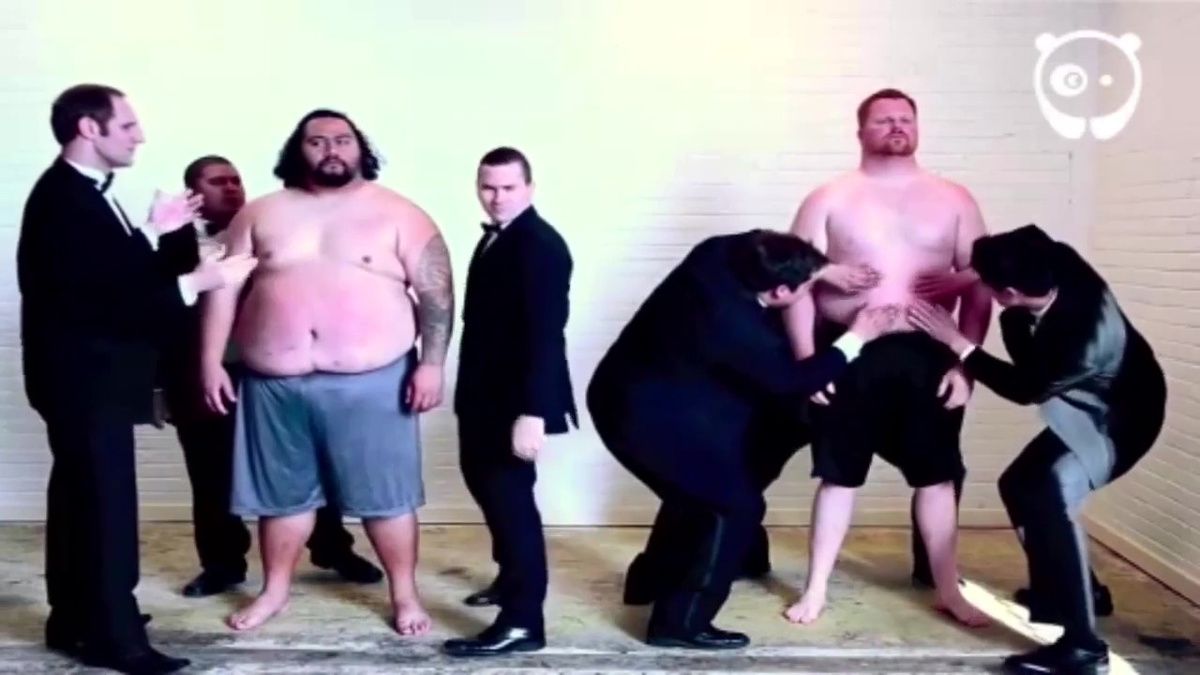 Thay vì chơi đàn, các nhạc công vỗ vào bụng mỡ của 2 chàng béo và từ đó, một bản nhạc vang lên.
